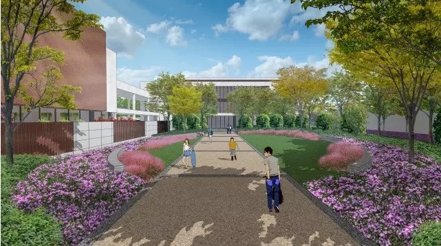 视觉——入口自行车停放区以一条梧桐大道贯穿,并配以散布于野花草坪上的盛花和色叶乔木。四季不同的色彩变化为师生呈现一场视觉盛宴。